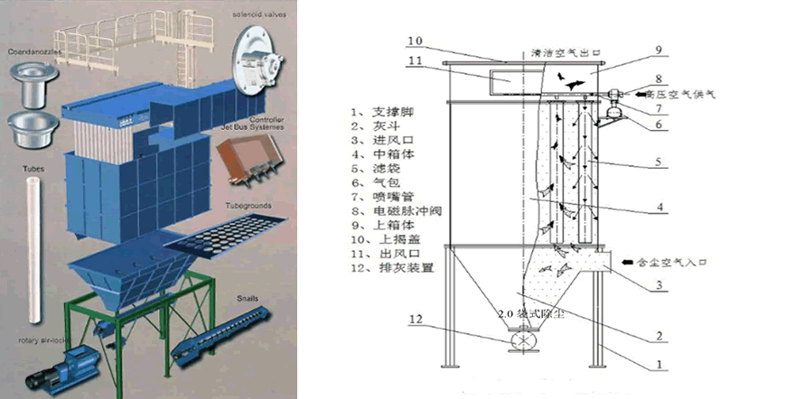 脈沖布袋除塵器由灰斗、上箱體、中箱體、布袋(根據(jù)煙氣溫度不同,可采用PTFE、P84等高性能復(fù)合布袋)、清灰噴吹裝置等部分組成。工作時(shí),高溫?zé)煔庥苫叶飞系倪M(jìn)風(fēng)口流入灰斗,由于重力沉降作用,粗塵粒直接落入灰斗底部,起到預(yù)收塵的作用,同時(shí)氣流速度變慢,輕微粉塵隨氣流轉(zhuǎn)折向上進(jìn)入中箱體,粉塵被高溫濾袋過濾阻留,積附在濾袋外表面,過濾后的氣體透過濾袋進(jìn)入上箱體至出風(fēng)口,經(jīng)引風(fēng)機(jī)排至大氣。積附在濾袋外壁的粉塵不斷增加,當(dāng)達(dá)到設(shè)定時(shí)間,脈沖控制儀順序間隔觸發(fā)開啟脈沖電磁閥,使壓縮空氣包內(nèi)的壓縮空氣經(jīng)噴吹管對(duì)各排濾袋進(jìn)行脈沖噴吹清灰,使濾袋在瞬間急劇膨脹抖落積附在濾袋外壁的粉塵,從濾袋上剝離的粉塵沉降至灰斗,經(jīng)過卸灰閘閥排出,除塵效率≥99%,適應(yīng)于各種除塵行業(yè)。