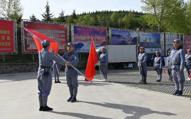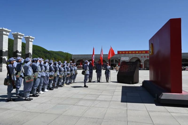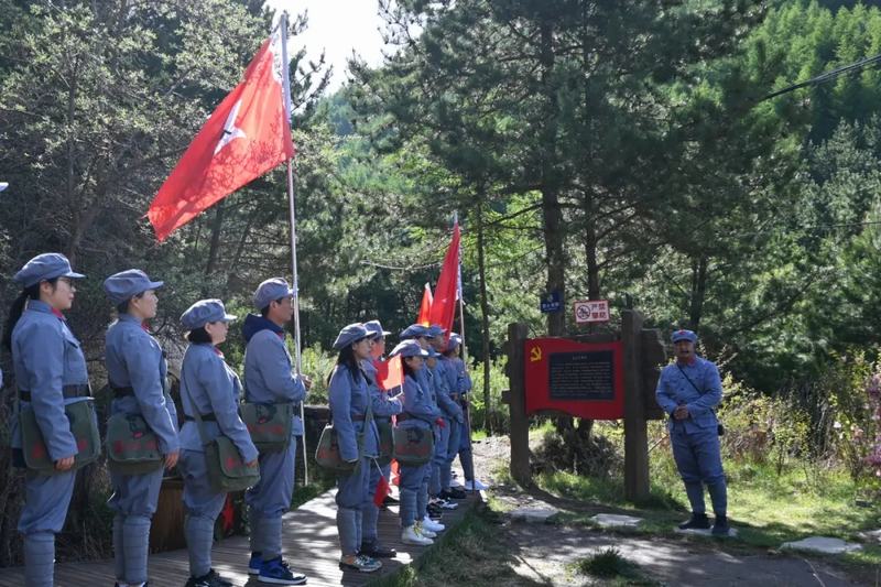 全體黨員懷著激動的心情換上紅軍服、佩戴好黨徽,按照長征中紅一、紅二、紅四方面軍的編制分成三隊依次舉行授旗儀式,在大家齊頌毛主席詩詞《清平樂·六盤山》后,懷著對長征路的憧憬向山頂出發。